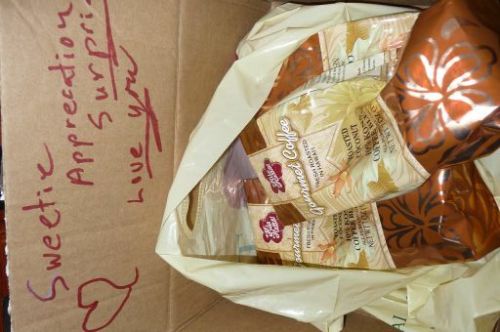 I lifted the newspaper packing material and there were three bags of Hawaiian Coconut coffee. He remembered how sad I had been that the Hilo Hattie’s near us had closed, which is where I used buy that coffee. So he ordered it from the Hilo Hattie’s where we had shopped when we were in Hawaii last August for our anniversary. And he had to actually call them because orders can’t be placed online due to their bankruptcy.