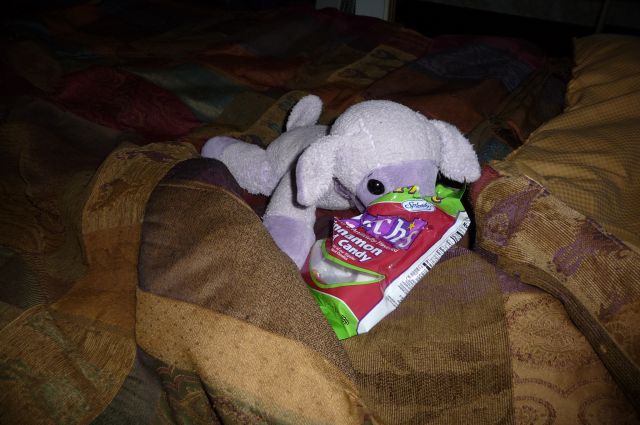 * My husband, who rigged up two of my favorite things (Lovey the Lavender Lamb and my cinnamon disk candy). The dude knows how to make me laugh. LOVEY, GET OUT OF MY CANDY!