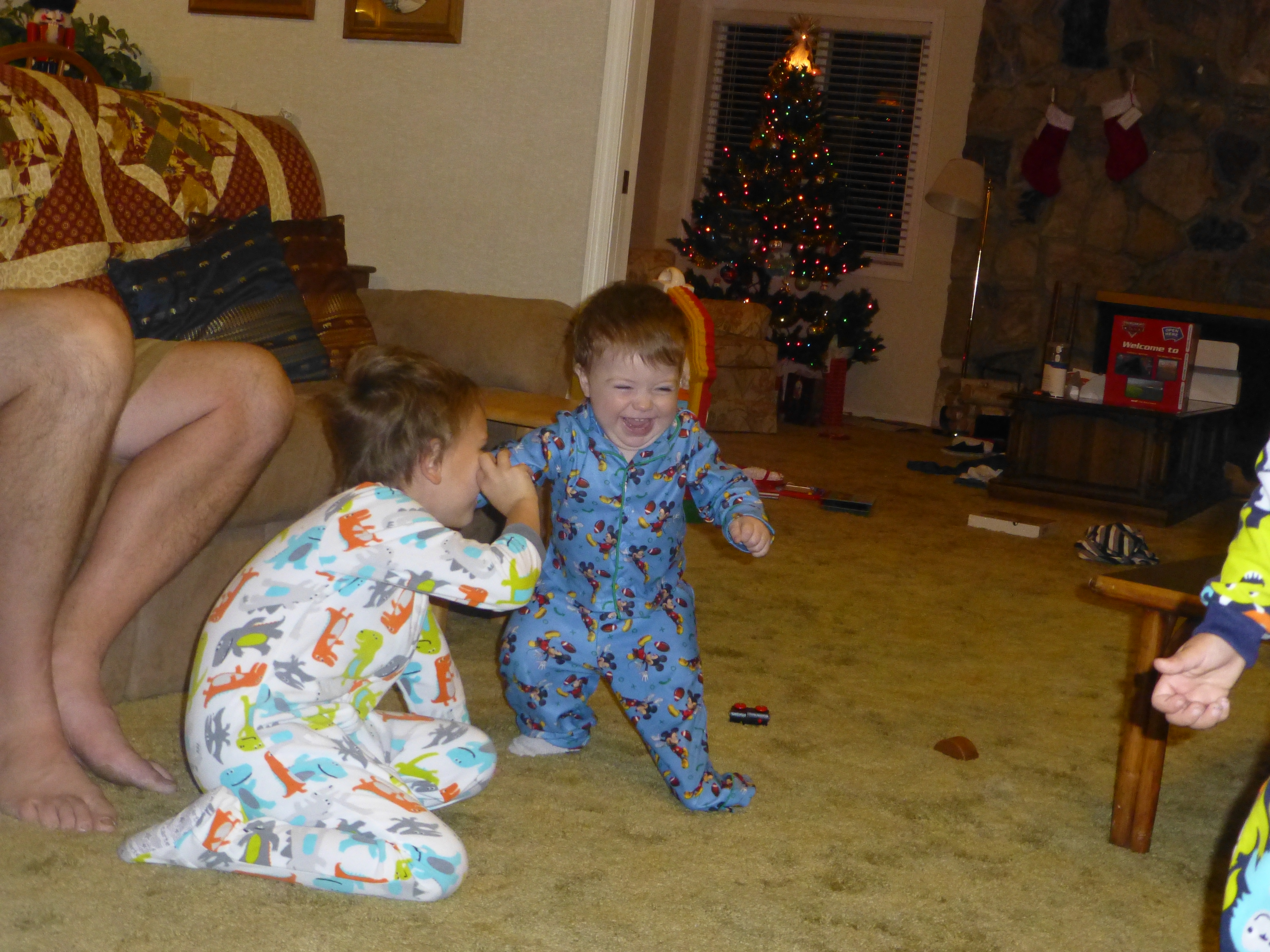 Walking — You started taking independent steps on 11/27, and every day you would add more and more. Now, you’re pretty much a full-on biped! I can put you down and you stand there independently (instead of folding to a sitting position), and as of January 1st, you toddle around about 95% of the time, and 5% of the time you crawl. Now, at 13 months, crawling is pretty rare. I have to tell you, I thought the crawling naked baby before bathtime was funny, but the walking naked baby before bathtime is absolutely hilarious! Especially because you are obsessed with the big red Yoga ball that we keep in the bedroom. I used to bounce you on that ball when you were a newborn to get you to go to sleep, now you think bouncing on that ball is hilarious (which is why I stopped doing it when you were around 4-5 months old). It’s amazing how much a difference a month, or even a week, makes in your development. Last year, at one month old, you would lay on your back and smile at the ceiling fan as it went round and round.