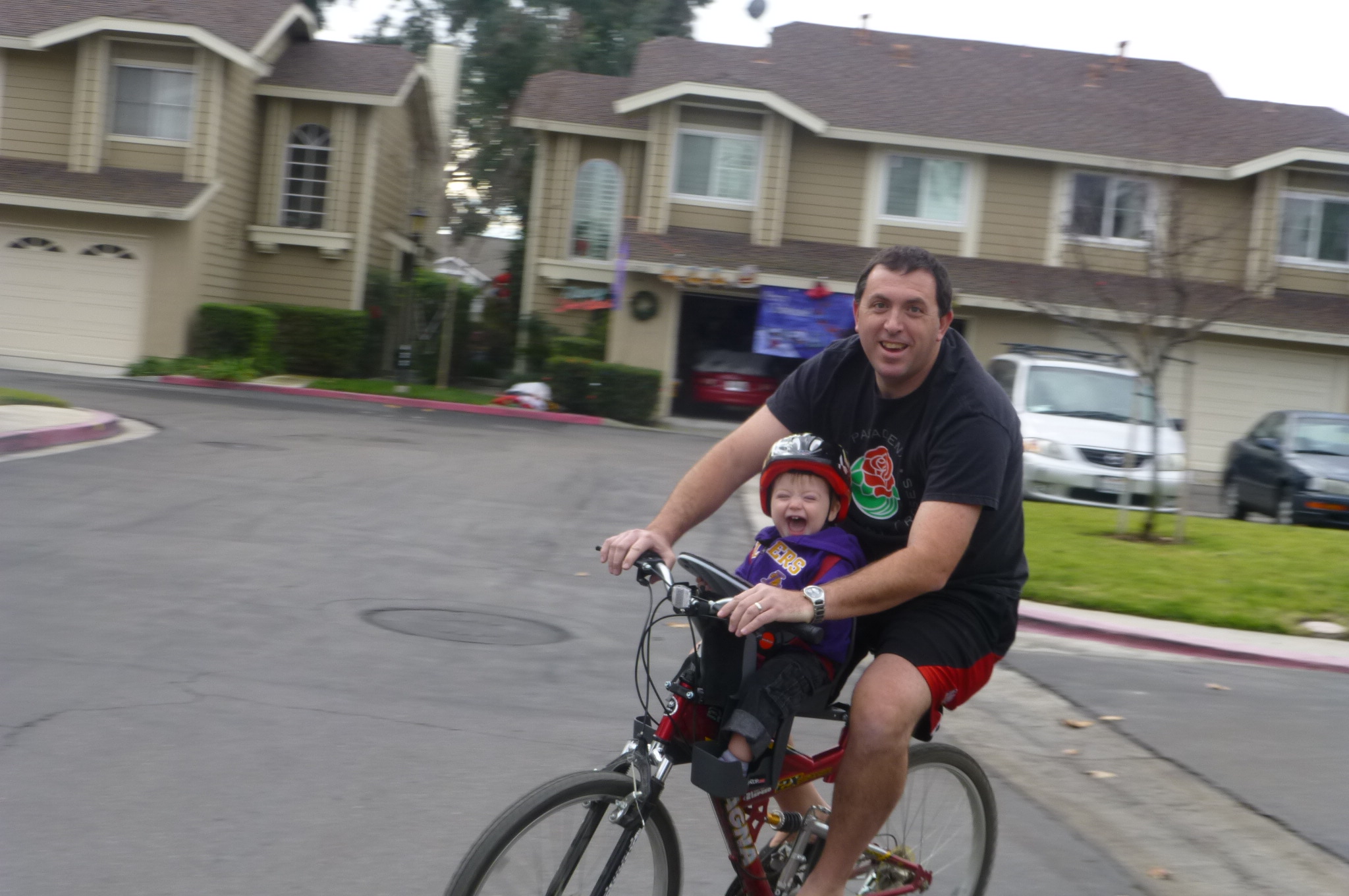 For New Year’s day, your father installed the WeeRide Kangaroo Bicycle seat on his bike; one of his Christmas presents from me. He’d had a bicycle trailer on his wish list forever, but the reviews weren’t nearly as glowing on that as they were for the WeeRide. Having now seen this in action, I can completely understand why. Mounted on the center bar, you’re right up with us, hugged by a parent the entire ride. We took you for a spin around the neighborhood and you immensely enjoyed being up with us where all the activity happens and you could see what was going on.