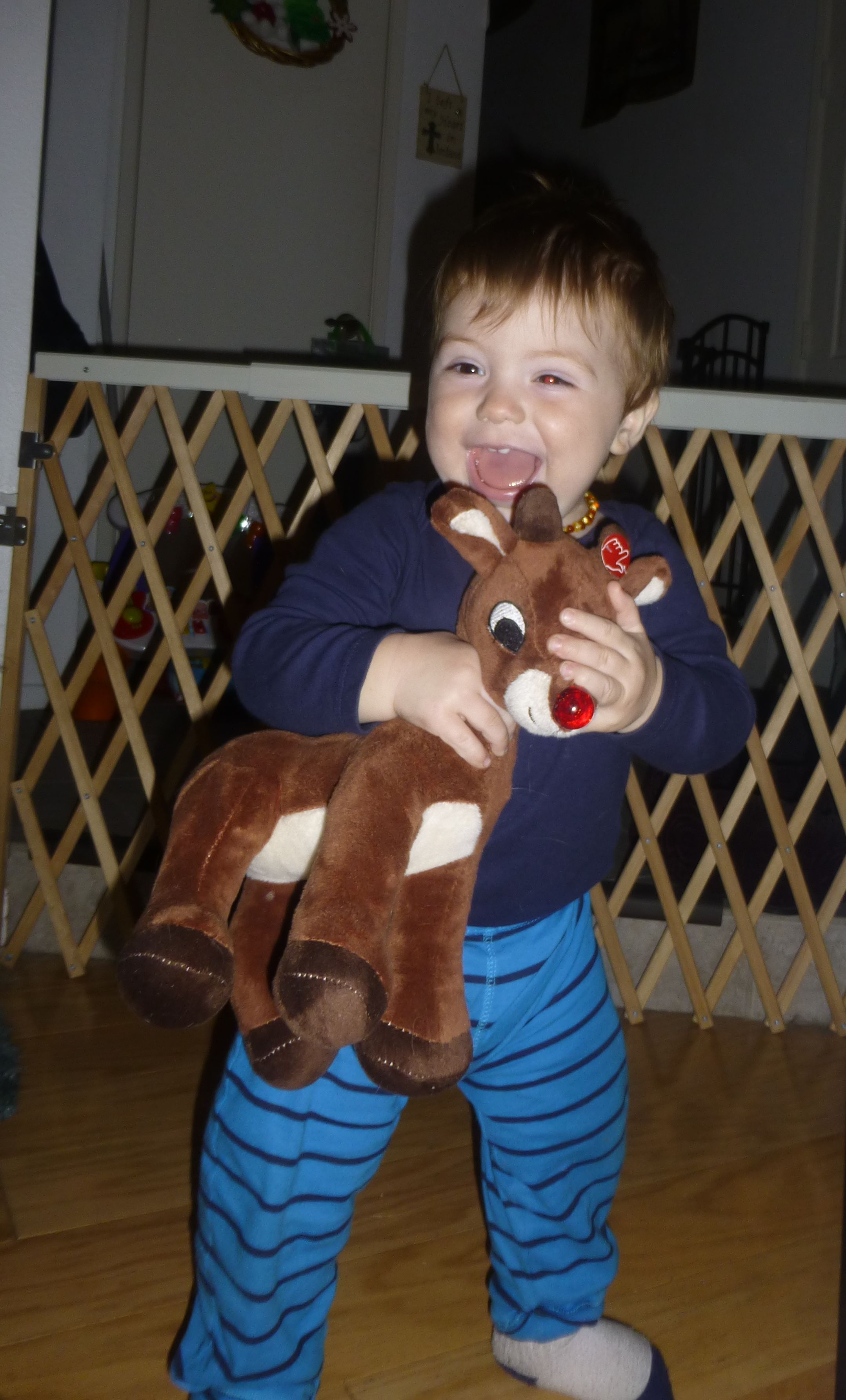 I bought a stuffed Rudolph on clearance at Big Lots after Christmas. You showed zero interest in it while we were shopping. I got it home and stuck it on the back of the couch, not even realizing that it’s the exact size of our cats. Well, now it’s your own personal Rudolph “CAT!” It’s one of the first things you ask for every morning, and you carry it around with you, lay down on top of it, smile at it, drool on it. Silly me, thinking it would be a cute Christmas decoration.