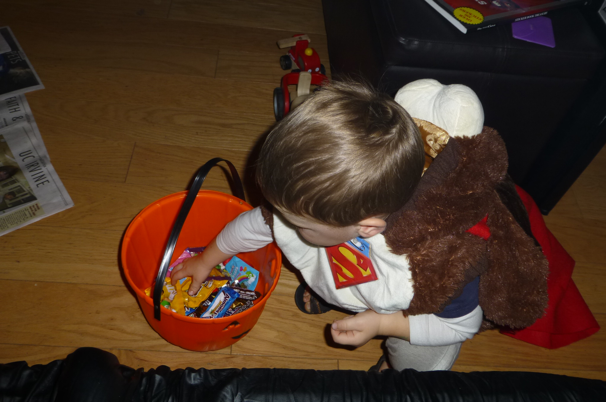10/31 — you trick-or-treated as Krypto (aka Super Dog). It took you one time and you had the routine down, knock on the door, say trick-or-treat, get candy, say thank you … visit if they want to and then move on. You loved your pumpkin with candy it, although you don’t yet know that candy gets opened and eaten. You just like to have it and add to your candy collection.