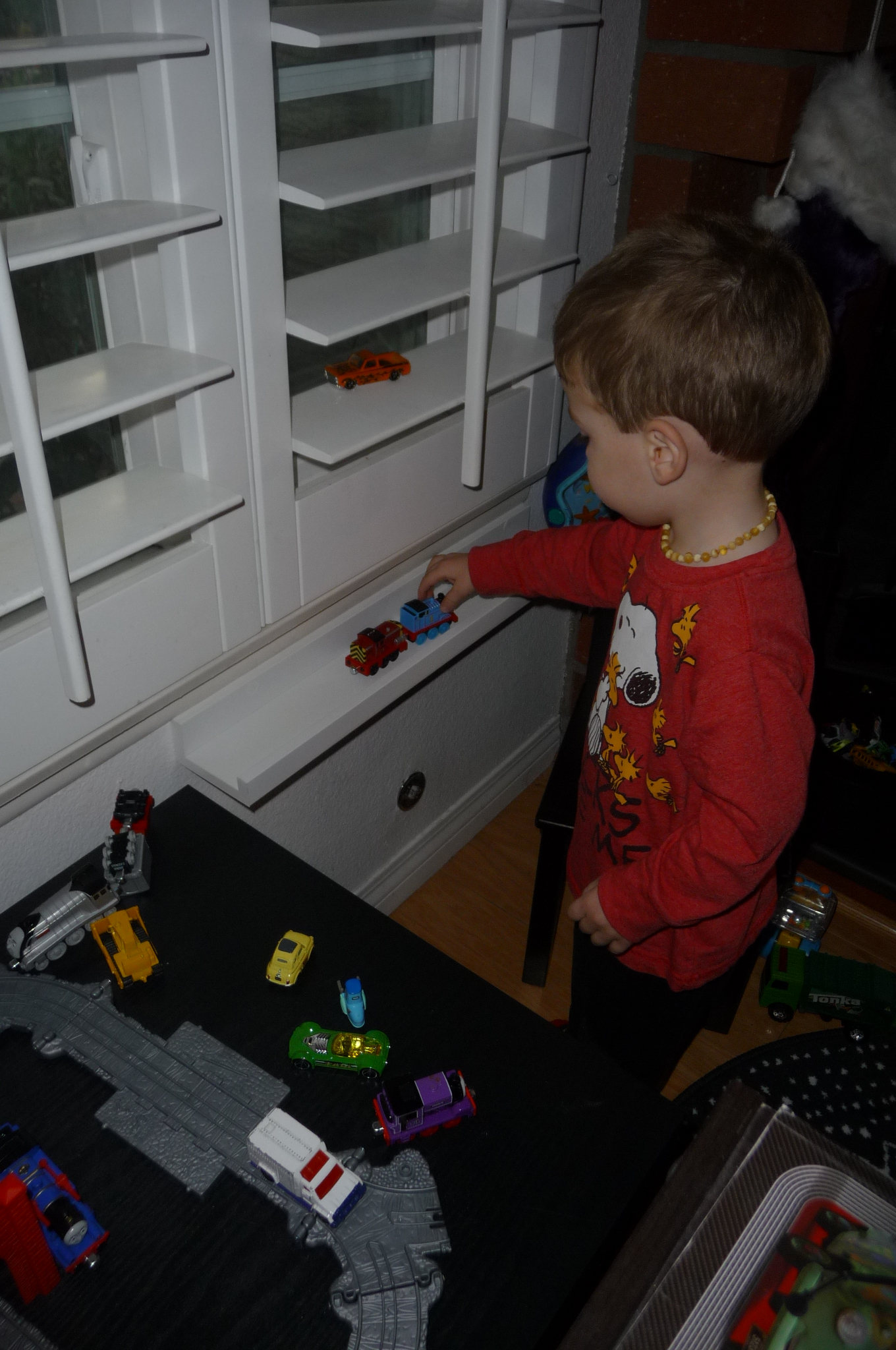 You really enjoy driving your cars and trains on the edges of shelves and tables. Apparently, the shutters are fair game for driving things on, too. When we go out to eat, the triangular tent cards on the table are “garages” according to you, and the cars get to park in them while we eat.