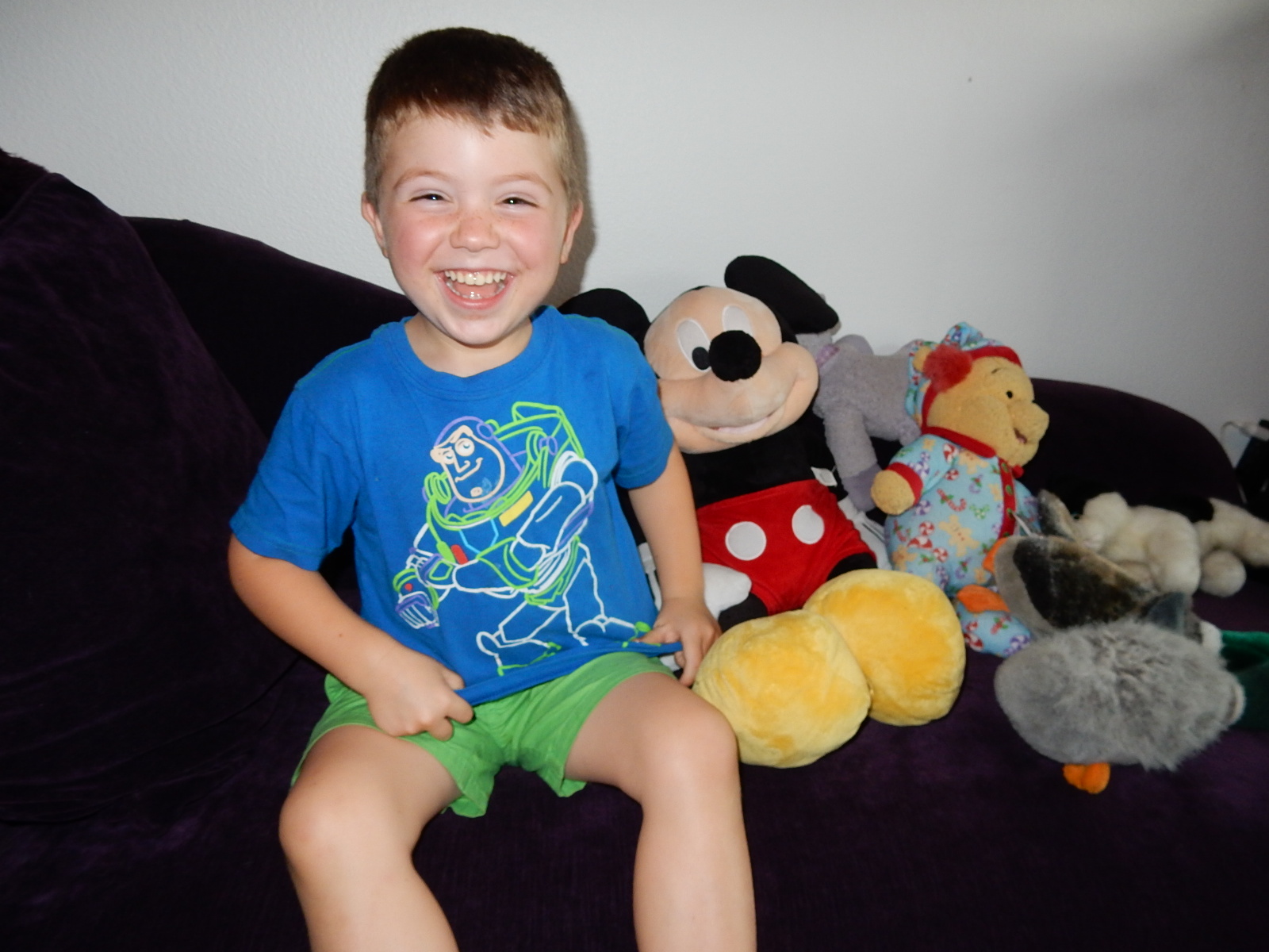 Today, on August 8, 2015 you turned 44 months old. You are 43 1/2″ tall and weigh 46 pounds, 10 ounces. You are wearing 5T or boys Small in shirts. You are in 5T two-piece pajamas; I don’t know what you are in footed pajamas since it’s summertime, so probably boys Small would be my guess. You are in 5T pants and shorts. Your shoes are size 12/13 (Crocs).