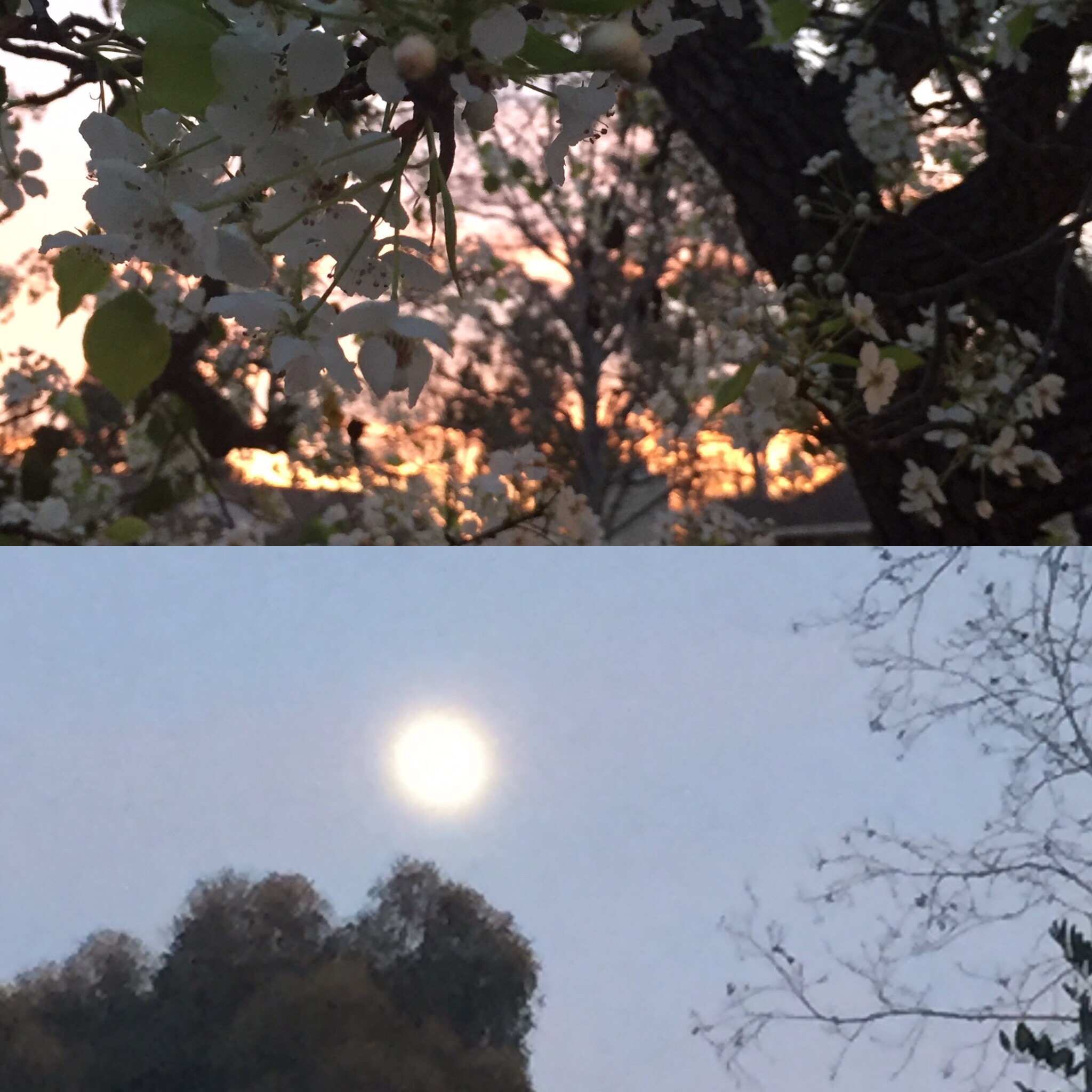 Earlier this evening, as I stood facing the pool, on my right there was a sunset visible between the branches of a tree laden with so many white blossoms that it looked like a popcorn tree.