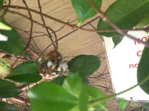 That made this year a real treat… given where the nest was located on a flimsy branch and the way their little nest split apart when the babies started growing (who knew baby hummingbirds could have too much butt??), we guessed that this might have been a first time momma. We hope she does better next year. So, we worked to protect them… Tony constructed a support beam and wrapped paper towels around it to provide “extra” nest (Tony checked on them last Sunday, Mother’s Day, and one of the babies had fallen out of the nest and was clutching onto a tiny twig for dear life, so that’s when he did nest construction!), and we blocked our pathway with a garbage can and put a sign out to the community’s landscapers to stay away, it was effective for delivery people as we found packages tucked behind our garbage can (ha), and we even tried to enter and exit through the garage when it was feasible, and we didn’t tell any of the neighbors about this every day miracle. Her nest for sure wouldn’t have stood up to the kidhandling that happened last year.