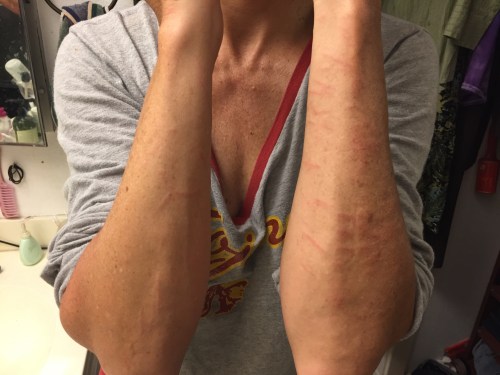 I’m not really sure, but around bedtime last night, I decided to actually pay attention to the itching I was feeling on my arms and actually LOOK at them, instead of just putting cold water on them. Goodness. Luckily I found some hydrocortisone cream, and by this morning the swelling had gone down.