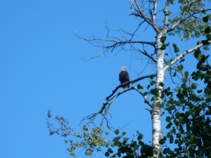 In our recent visit to Michigan, we visited the Husband’s aunt near Roger’s City.  Upon our arrival, after settling in a bit, we went out on the quads, the sole mission to explore.  I brought my cell phone, and figured that’d be good enough.  Yet, we rounded the corner to the lake and sitting atop the lookout was a bald eagle.  In the wild, a bald eagle!