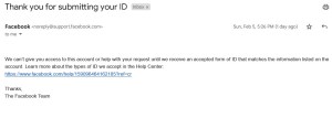 14 days since you saw me there… or something like that. Facebook disabled my account. No warning. They say they need an Identification. Which I provided to them. Once, twice, thrice… more than that, actually. Multiple IDs, multiple times. All of them rejected.