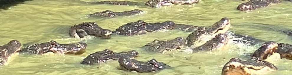 Gators & Friends Adventure Theme Park has many, many alligators of all sizes you can imagine. Big ones, medium ones, little ones, even (I’m certain) invisible ones. ha! We bought some animal food (you can feed everything except the meerkats and alligators, please), so we wandered through the park (again with the heat and humidity) with our animal food. The animals rushed us, starting with the fallow deer, then the kangaroos (OMG, roos!). I then encountered the miniature horses, who lifted up their right hoof and rhythmically knocked on their fence with it to get our attention. Yes, I fed them. There were two of them who turned their heads sideways and opened their lips so I could just pour a handful of food through their teeth and straight onto their tongue. I mean, WHO TRAINED WHO? They had a donkey/zebra (can’t remember what it’s called), lots of miniature goats and big goats, and lots of donkeys. We went over to watch them feed the big alligators – what a show. There was one that actually FLEW up out of the water to catch some of the food. Then it was time to hold the baby alligator… little guy was pretty chill and relaxed.