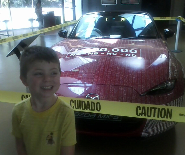 Mazda created the 1,000,000th Miata and it’s presently on tour. It had a stop at the Mazda headquarters in Irvine. I stopped and saw it on the way to work one morning, the same day that your Grandma D. brought you over to my work for a family lunch at the deli. I suggested that she take you by to see the Miata. That it was special to me since I’ve driven a Miata for 25 years now. I was tickled when she later texted me this picture of you. Although, she said you enjoyed the long fountain that is in the breezeway there more than the Miata.
