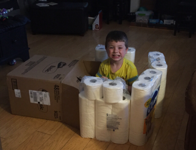 I ordered toilet paper from Amazon.com, and when it came, you absconded with the box and the toilet paper and said, “This is my little house!” I wasn’t thrilled to have this in the middle of the living room, but I knew it would be funny to me later, so I took a picture of you in your little house.